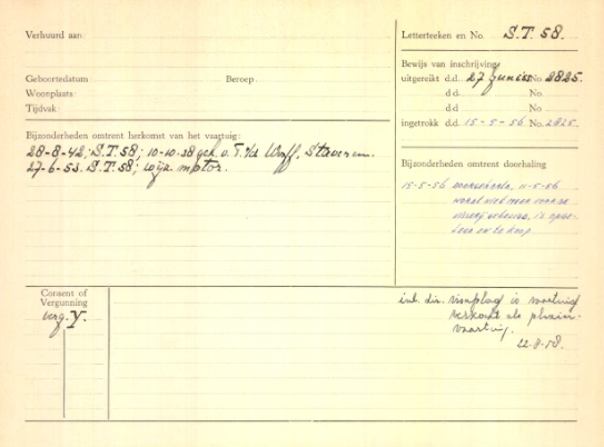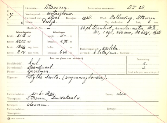 ST58, Naam Pietje, Lengte 11m, breedte 3,75mWerf Volharding Staveren, 22 pk Kromhout, ruwolie motor, 1 cyl, 480 omw, bunkercapaciteit 200 liter, verbruik 6 liter/uur, hoofdbedrijf kuil, Nevenbedrijf staand want, Plaats Ijsselmeer, Bemanning 3, Hijlke Smits, Geboortedatum 21-6-1899, Woonplaats Staveren, Smidstraat 4, Beroep Visser.